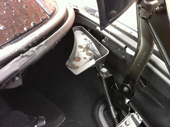 Day 3: It’s raining. The SLK’s bootlid has to be wide and flat for the foldy roof to work but that leaves no room for gutters to stop rain water dribbling onto your bags. So they’ve fitted little rain catchers you can see in the picture below with a bit of pipe which takes the water and dumps it under the car. Nice.
